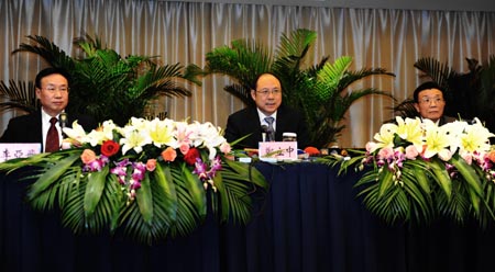 Zheng Lizhong (C), standing vice president of the Chinese mainland's Association for Relations Across the Taiwan Straits (ARATS), takes questions at a press conference after a preparatory discussion between leaders of the ARATS and those of the Taiwan-based Straits Exchange Foundation (SEF) in Fuzhou, capital of southeast China's Fujian Province, Dec. 10, 2009. The fourth round of talks between the two organizations will be held in Taizhong from Dec. 21 to Dec. 25.(Xinhua/Zhang Guojun)