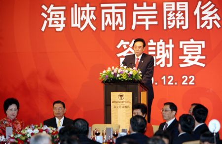 Chen Yunlin, president of the Chinese mainland's Association for Relations Across the Taiwan Straits (ARATS), speaks during the banquet held by ARATS, in Taichung of southeast China's Taiwan, Dec. 22, 2009. The ARATS held the banquet to express its thanks to the Taiwan-based Straits Exchange Foundation (SEF) and the people who had worked for the talks between the two organizations. (Xinhua/Yuan Man)
