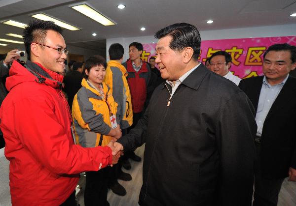 Jia Qinglin (R), chairman of the National Committee of the Chinese People's Political Consultative Conference, shakes hands with a member of Taiwan Medical and Rescuring team for Yushu earthquakes in Xining, capital of China's Qinghai Province, on April 26, 2010. (Xinhua/Huang Jingwen)