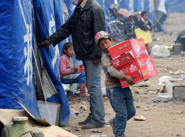 A kid transports food at tent area of the quake-hit Tibetan Autonomous Prefecture of Yushu, northwest China's Qinghai Province, April 20, 2010.(Xinhua/Li Ziheng)