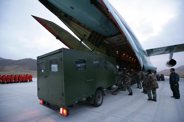 Sources with the Air Force said another Il-76 heavy carrier which brings 100 geological experts and heavy vehicles will take off from Chengdu on Thursday and head for Yushu.