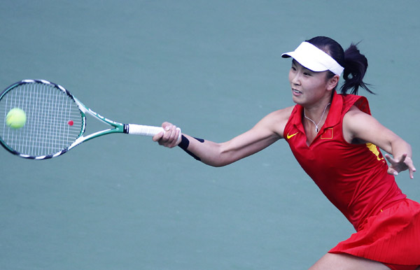 Peng Shuai of China returns the ball during the women's singles final of Tennis against Akgul Amanmuradova of Uzbekistan at the 16th Asian Games in Guangzhou, south China's Guangdong Province, Nov. 23, 2010.Peng Shuai won 2-0 and got the gold medal. (Xinhua/Chen Jianli)
