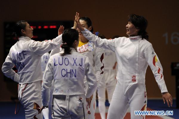 Xu Anqi (R1) of China celebrates with teammates during the women's team epee semifinal against South Korea at the 16th Asian Games in Guangzhou, south China's Guangdong Province, Nov. 23, 2010. China won the match by 43-28 and entered the final. (Xinhua/Yang Lei)