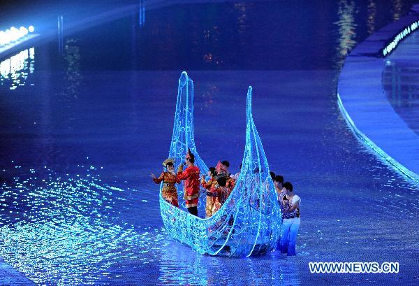 Singers perform on a boat at the closing ceremony of the 16th Asian Games held at the Haixinsha Island in Guangzhou, south China's Guangdong Province, on Nov. 27, 2010. (Xinhua/Yang Shiyao)