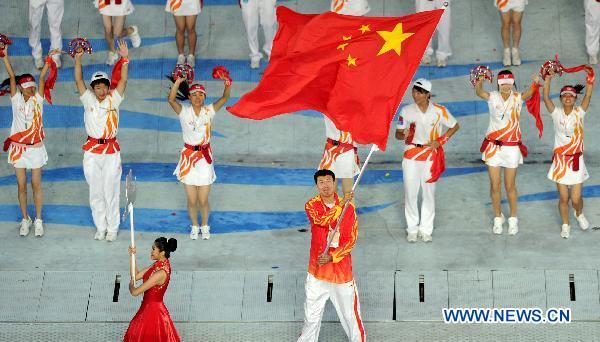 Chinese basketball player Wang Zhizhi holds the national flag at the closing ceremony of the 16th Asian Games held at the Haixinsha Island in Guangzhou, south China's Guangdong Province, on Nov. 27, 2010.(Xinhua/Yang Lei)