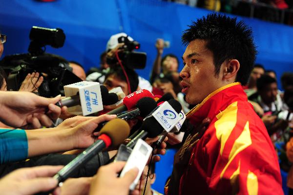 China's Lin Dan receives interviews after defeating Lee Chong Wei of Malaysia in the men's singles final match of badminton at the 16th Asian Games in Guangzhou, south China's Guangdong Province, Nov. 21, 2010. Lin Dan won 2-1 to claim the title of the event at Asian Games the first time. (Xinhua/Lu Hanxin)