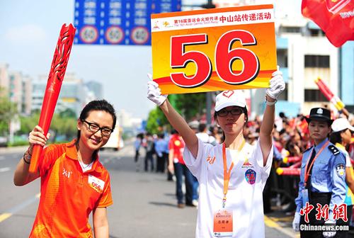 The 11.2 km rout ended at Civil Fitness Square, where 73-year-old Sun Bisheng, whose name means "must-win" in Chinese, lit the "basin of holy fire." Fittingly, Sun is a great grand nephew of Sun Zhongshan, the namesake of the city. He said, "It is an honor for me to be a torch bearer for the Asian Games. I hope the spirit of Sun Zhongshan can live on and spread. "