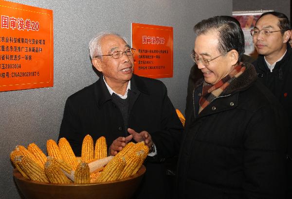 Chinese Premier Wen Jiabao (2nd R) listens as agricultural expert Cheng Xiangwen introduces a new species of corn at an agricultural research institute in Hebi City of central China's Henan Province, Jan. 22, 2011. Wen Jiabao wrapped up an inspection tour of the drought-hit Henan Province from Friday to Saturday, urging more efforts by local governments to ensure agricultural production threatened by the prolonged drought in many of China's grain producing areas. (Xinhua/Yao Dawei)