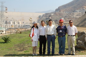 考察输变电站 与中方负责人在大坝前合影