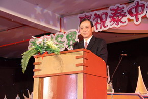 管木大使在晚会上发表了热情洋溢的致辞。他表示,自1975年建交以来,中泰关系在平等友好、互利互惠的基础上保持良好发展,两国战略合作关系平稳、健康推进,“中泰一家亲”的传统友谊日益深入人心。中泰两国关系已经成为不同社会制度国家之间和谐共处、互利合作和共同发展的典范。他回顾了中泰建交35年来两国在政治、经贸、军事、科教、文化等领域取得的丰硕成果,同时盛赞广大旅泰华侨华人在推动中泰关系发展,支持祖(籍)国建设及和平统一大业等方面发挥的重要作用,希望两国政府和人民携手并肩,共创更加美好的未来。