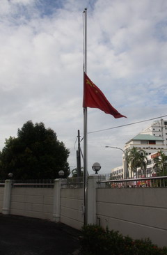 2010年8月15日,中国驻古晋总领馆举行下半旗仪式,向甘肃舟曲特大山洪泥石流遇难同胞表示深切哀悼。当天,总领馆全体馆员及家属衣着朴素,停止一切公共娱乐活动,同全国人民一道沉痛悼念舟曲遇难同胞。