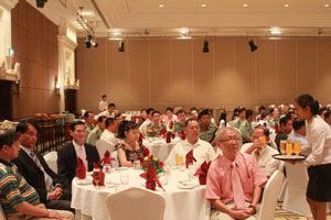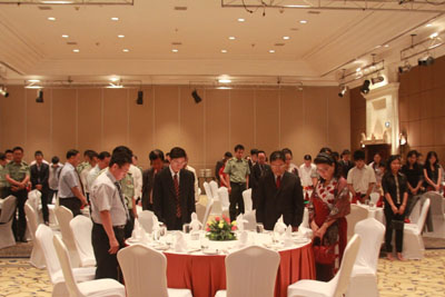在招待会开始前,全体嘉宾起立为甘肃舟曲遇难同胞默哀一分钟。贺代办代表大使馆对柬华人华侨和社会各界踊跃为灾区捐款、以实际行动大力支持灾区救灾和重建工作表示衷心感谢。