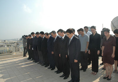 9时整,主持人宣布,为沉痛悼念在甘肃舟曲特大山洪泥石流自然灾害中遇难的同胞,举行降半旗仪式。随后,全体馆员肃立,默哀三分钟。