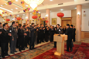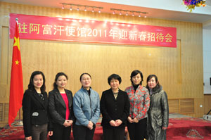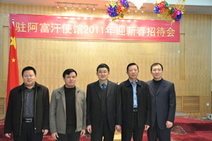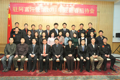 2011年1月21日晚,中国驻阿富汗使馆内张灯结彩、欢乐喜庆。驻阿富汗大使郑清典为全体在阿华人华侨和中资机构代表举办盛大的2011年春节招待会。中冶江铜、中铁十四局、中兴通讯、华为技术等中资机构代表、新华社、中央电视台记者、旅阿华人华侨及使馆全体人员欢聚一堂,喜迎农历兔年新春。