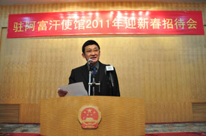 郑大使首先向大家致以节日问候和良好祝愿,表示,过去的一年,对我们的国家和人民来说是极不平凡的一年,面对复杂的国际国内环境和各种困难,在党中央的领导下,中国人民团结一心,开拓进取,克服国际金融危机影响,确保国民经济平稳较快发展,民生持续改善,上海世博会、广州亚运会成功举办,“嫦娥”奔月、“蛟龙”探海等喜事不断,我国的综合国力和影响力进一步提升。与此同时,中阿全面合作伙伴关系继续深入向前发展,卡尔扎伊总统成功访华,两国在政治、经济、军事等各领域里的交流与合作取得丰硕成果。
