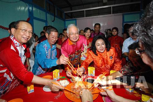 2月20日,在马来西亚第二大的华人新村雪兰莪州班达马兰,马来西亚总理纳吉布(中)与当地华人华侨一起“捞鱼生”。