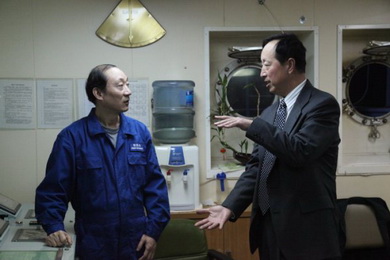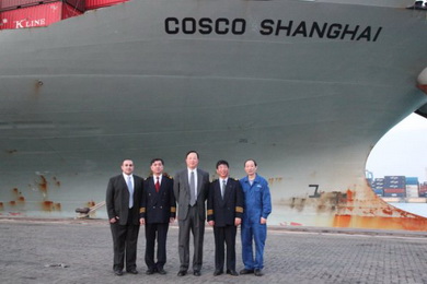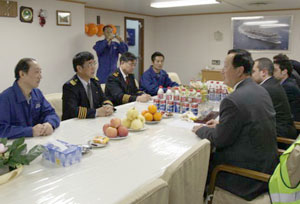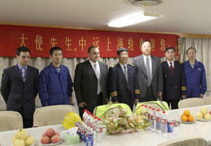 张大使在船长李俊明和政委沈根娣陪同下,登上上海号与全体船员一一握手表示亲切慰问。他先后进到驾驶室、动力舱等部位仔细察看,了解情况。接着张大使认真听取了李船长的工作汇报。上海号是中远公司所属的中型集装箱船。长280米,宽39米,动力4.3万千瓦,载货量5446标准箱。李船长说,中远上海分公司60年来从小到大,如今成为拥有百余艘巨型货轮的强大公司,航线遍布世界各大洋。上海号全船由26名中国海员驾驶和服务,他们责任心强,技术精湛,确保轮船航行快捷安全。
