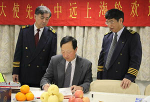 张大使高兴地表示,中远在建国初期和30年改革开放过程中不仅为国家赚取了巨额外汇,自己也不断发展壮大。有了你们的辛勤工作,才有了国家的繁荣富强,也使我们在外交战线上理更直,气更壮。希望大家为国家经济发展和经贸往来继续努力。中远公司无论在马耳他遇到任何困难,使馆都会尽力协助,做好服务。张大使还欣然为上海号题词“感谢中远上海号货轮为中华民族崛起做出的巨大贡献”。