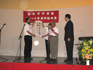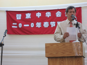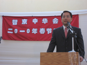 吕凡大使和智京中华会馆主席胡金维先生分别在晚会上发表讲话,盛赞建国60周年特别是改革开放30多年来中国取得的辉煌成就,衷心祝愿我们伟大的祖国日益繁荣昌盛,祝所有旅智华侨、华人身体健康、生意兴隆、阖家幸福、虎年大吉。