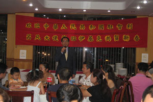 9日晚, 旅居伊基克的华商、华侨、华人、台湾同胞以及中资公司代表等160多人出席了欢迎新大使、共度新春佳节聚餐会。吕大使在会上发表讲话,简要介绍了国内政治稳定、经济发展的大好形势,对旅居伊基克的侨胞、台胞等多年来为支持国内建设,特别是在祖国南方发生冰冻雪灾和汶川发生强烈地震后踊跃捐款、慷慨解囊的无私奉献精神,以及为促进中智友好关系发展所做的努力和贡献表示衷心的感谢。希望大家继续和衷共济,为国家的经济发展和祖国的和平统一做出自己的努力。祝全体侨胞在新的一年里生意兴隆,事业发达。