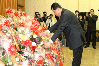 使馆大厅布置得庄严肃穆。使馆珍藏的孙中山先生半身铜像坐落在高台上,铜像前摆满了在英侨团、机构和个人敬献的花篮。香港、澳门特区政府驻英机构,全英华人华侨中国统一促进会等侨团,中资企业英国协会,全英中国学生学者联谊会,长荣集团、英国西东青年商会智囊团等台湾公司和社团等200多名代表参加了纪念活动。