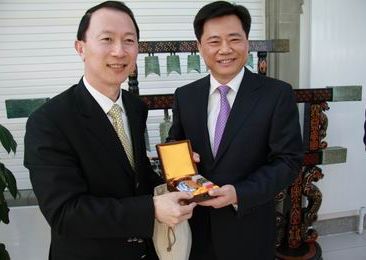 中国侨联副主席董中原向使馆和华侨华人代表赠送了礼物。