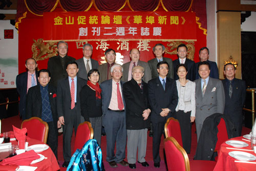 中国侨网消息:2008年1月12日晚,由旧金山湾区中国统一促进会出版的《金山促统论坛》月刊,在美国旧金山华埠四海酒家举行两周年庆会,秘书长蔡文耀主持了庆会。中华人民共和国驻旧金山总领事高占生夫妇、副总事王新平、领事童学军、陈晓毅、陶洁明、宋洋,费城美洲中国统一促进联合总会会长梁浩龙夫妇,以及长期为《金山促统论坛》写稿的作家陈子岩、邝大任、黎志滔、阿荣伯、梅彭康等等嘉宾出席了庆会。
