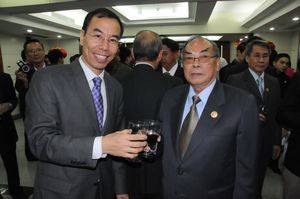 招待会前,陈代办专门召集60多位侨领举行长达二个多小时座谈,向他们介绍了一年来使馆重视并改进领事工作的主要情况,并就使馆的领侨工作、侨胞们面临的困难和问题听取大家意见,张家榜、许可祝两位领事解答了侨领们提出的问题。 |