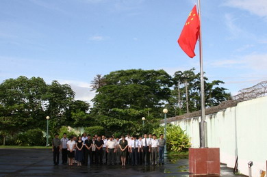 当地时间8月15日早8时,中国驻圭亚那使馆全体馆员和援圭医疗队专家在使馆举行降半旗仪式,深切悼念在甘肃省舟曲县特大山洪泥石流灾害中遇难的同胞。全体人员默哀三分钟,遥寄哀思。