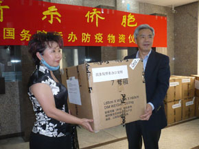 2009年5月6日,来自墨西哥中华会馆、墨西哥华人华侨社团联合总会和墨西哥台湾商会的代表在中国驻墨西哥大使馆接受国侨办赠送的口罩。