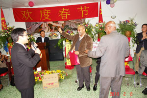 李大使在牛年即将过去、虎年来临之际转达了外交部等相关部委领导对全体驻厄人员的问候,简要回顾了2009年祖国在政治、经济等领域取得的重大成就,以及中厄两国各领域合作进展情况,感谢全体在厄同胞过去一年中为加强两国友谊所做贡献,鼓励大家再接再厉,努力将双方务实合作推向新水平。