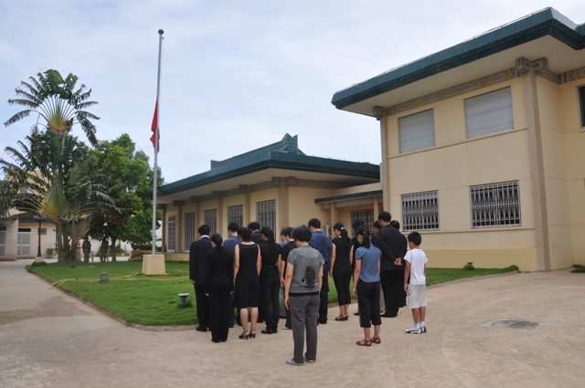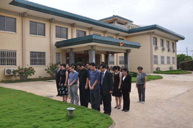 使馆广场上气氛庄严肃穆,全体馆员及家属身着素服,目视国旗升至顶端后缓缓降至半旗。在临时代办史大多带领下,全体人员怀着十分沉痛的心情,默哀三分钟,深切缅怀甘肃舟曲特大山洪泥石流遇难同胞。