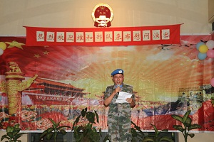 郁大使在致辞中首先代表使馆向维和部队官兵表示热烈欢迎,对他们不辞辛苦来布与使馆举行联谊晚会表示诚挚谢意。郁大使对赴刚果(金)维和部队取得的成绩予以充分肯定。他说,官兵们为了维护地区和平,肩负祖国的重托,远赴非洲大陆执行维和任务,克服各种艰难险阻,出色完成了维和工程和医疗保障等任务,以实际行动彰显了中国政府和军队维护地区和平与稳定、促进非洲发展、推动刚果(金)东部地区和平进程的愿望和主张。郁大使还表示,积极参与维和行动是加强中非新型战略伙伴关系的新亮点,进一步提升了中国的国际地位和形象。我们今天之所以能取得如此巨大的成就,是与党的英明、正确领导分不开的。不久我们将迎来中国共产党建党九十周年华诞,我们的党已走过了九十载春秋,并取得了举世瞩目的光辉业绩。我们要更加珍惜党领导我们所取得的这一切,加倍努力,以实际行动向建党九十周年献礼。