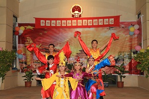 当晚,驻布使馆宫灯高挂,彩旗招展。大家载歌载舞,共度良宵。联谊晚会在热烈、欢乐、祥和的气氛中进行。