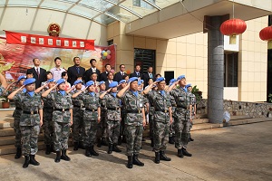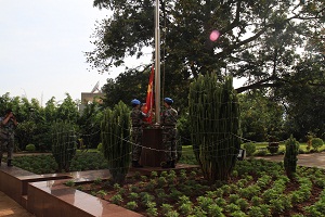 5月15日,中国赴刚果(金)维和部队官兵与驻布使馆全体人员在使馆举行了主题为“永远和祖国心连心”的升旗仪式。上午九点,在雄壮的国歌声中,维和官兵将国旗徐徐升起,使馆全体馆员身着正装,注视国旗,齐唱《义勇军进行曲》。同志们士气高昂,精神振奋,场面热烈而庄重。