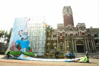 图文:台当局“入联”标语布幔悬挂半年 拆了!