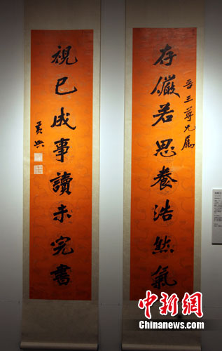 9月27日,辛亥革命即将100周年之际,辛亥革命领导人之一黄兴的手书对联在台北市南海路历史博物馆展出。