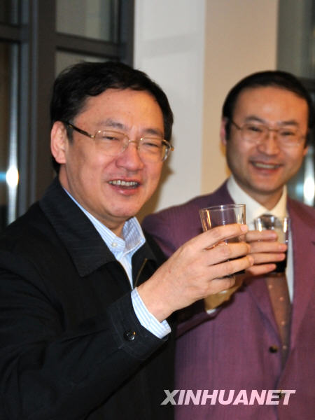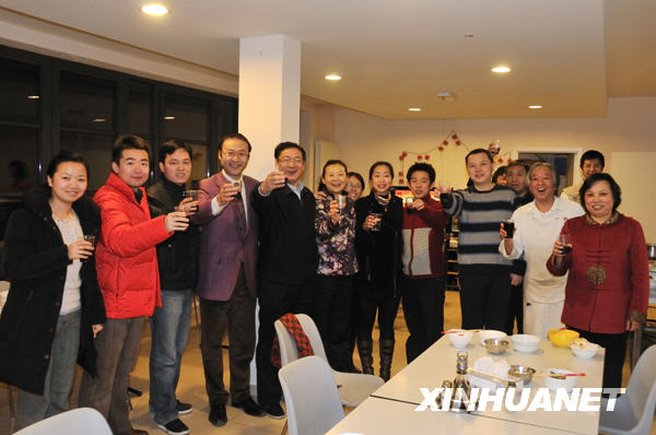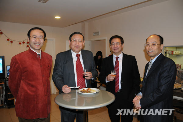 欧洲总分社大年二十九举办新年招待会,中国驻比利时王国使馆张援远大使(左二)出席,欧洲总分社刘江社长(左三),姜岩副社长(左一) 新华网发