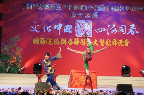 中新网2月25日电 由国务院侨办和中国海外交流协会组派的“文化中国·四海同春”2010年春节赴菲律宾艺术小组在宿务进行了精彩的演出。浓郁的民俗文化气息,精湛的演艺水平,受到了当地侨胞的极大赞誉。