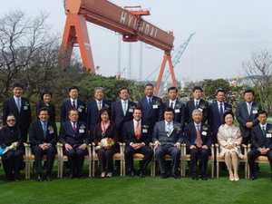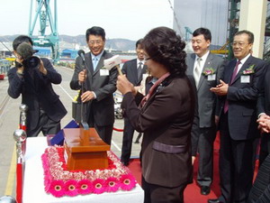 30日中午,韩国蔚山港现代重工造船厂宾客如织,人头攒动,来宾们纷纷聚集到“COSCO KOREA”命名仪式现场,见证这一美好的时刻。COSCO KOREN大型集装箱船长达350米,宽余40米,载重量高达10万吨,可装载8500个标准集装箱(TEU),由加拿大SEASPAN(塞斯潘)公司出资,现代重工建造,中远集装箱运输有限公司租赁。命名交船仪式在现代重工造船厂码头举行,张良副总裁夫人刘兰英女士按惯例为新船命名、敲香槟。随后,参加仪式的各方代表合影留念并登船参观。