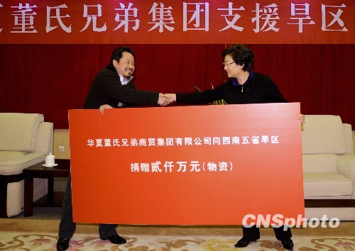 3月30日,华夏董氏兄弟集团执行董事、旅澳大利亚侨胞董佩永通过国务院侨办“侨爱工程”向西南五省捐赠价值2000余万元人民币的物资,帮助灾区民众缓解饮水困难。图为国侨办主任李海峰接受董佩永捐赠。 中新社发 廖攀 摄