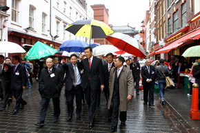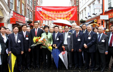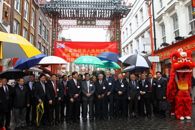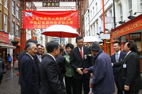 2010年3月30日下午,春雨霏霏,伦敦唐人街张灯结彩,高耸的牌楼正面悬挂着“全英华侨华人热烈欢迎中国驻英国特命全权大使刘晓明伉俪履新”的红色横幅。旅英侨界代表在全英华人联合总会会长李文兴的带领下,怀着激动的心情,冒雨在牌楼前迎候刘晓明大使夫妇。当刘大使的轿车缓缓驶进唐人街时,锣鼓响起,一对红白狮子欢跃舞动。身着节日盛装的少女上前给大使夫人献花。大使夫妇与列队等候的侨领们一一握手,合影留念。