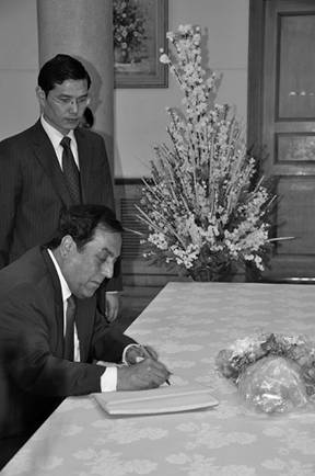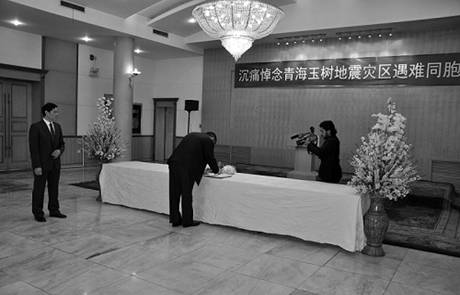 使馆国旗徐徐降下,全体同志怀着无比悲痛的心情,肃立默哀三分钟。随后,在使馆临时布置的灵堂内,同志们面向悬挂着“沉痛悼念青海玉树地震灾区遇难同胞”的挽幅三鞠躬,并依次在哀思簿上留言,向地震遇难同胞致以沉痛哀悼。