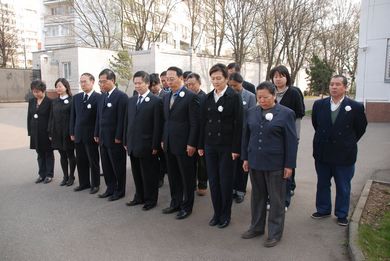 2010年4月21日清晨,中国驻白俄罗斯使馆临时代办陈代文率使馆全体馆员沉痛悼念青海玉树地震遇难同胞。