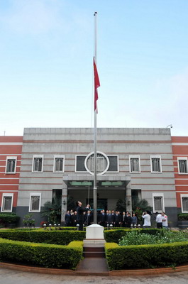 2010年4月21日清晨,中国驻肯尼亚使馆举行哀悼仪式,为青海玉树地震中遇难同胞下半旗志哀。