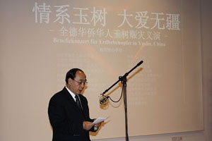 吴大使在讲话中向参加义演的全体演职人员和观众致意,感谢德国侨学界对灾区人民的关心。吴大使说,旅德华侨华人及留学生自发组织此次赈灾义演,为玉树灾区人民筹款,体现了“一方有难、八方支援”的精神,体现了广大海外游子的拳拳爱心。傅春平和崔鹏程代表德国华侨华人及留学生发言,表达对灾区人民的无限牵挂和深厚情谊,相信在中国共产党和中国政府的坚强领导下,在全国各族人民和海外侨学界的全力支持下,灾区人民一定能够战胜困难,重建家园。