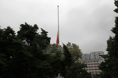上午8:00,中国驻朝鲜大使馆为甘肃舟曲遇难同胞下半旗志哀。在全体馆员的深情凝望下,国旗到达旗杆顶部后缓缓降下,大家神情肃穆,心情沉重,痛思在灾难中不幸逝去的祖国亲人。