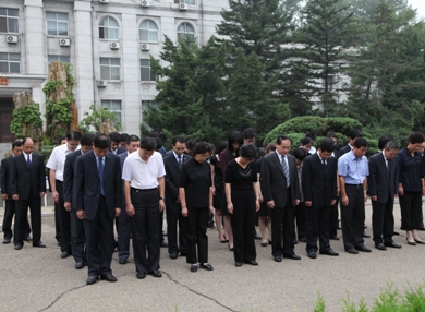 2010年8月15日,中华大地举国同悲。常驻朝鲜的中国大使馆全体外交官遥向祖国,与祖国人民一道,沉痛悼念甘肃舟曲特大山洪泥石流遇难同胞。