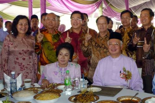 华社领袖举起“一个马来西亚”的手势,与首相纳吉伉俪合照,后排左起:拿督张妹、拿督黎天发、拿督彭子明、拿督斯里林锦胜、丹斯里方天兴及方振源。(图:光明日报)