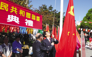 2010年9月25日中午,旧金山湾区各界华人庆祝中国国庆委员会在华埠花园角广场隆重举办国庆升旗典礼,庆祝祖国61周岁华诞,驻旧金山总领事高占生应邀出席。在雄壮的《义勇军进行曲》中,高总领事与伍璇灿顾问共同升起鲜艳的五星红旗。旧金山湾区中国国庆委员会执行主席黄荣辉、中国海外交流协会顾问池洪湖、中国侨联海外顾问伍璇灿、朱灼枢、关洛章等侨胞近500人出席观礼。